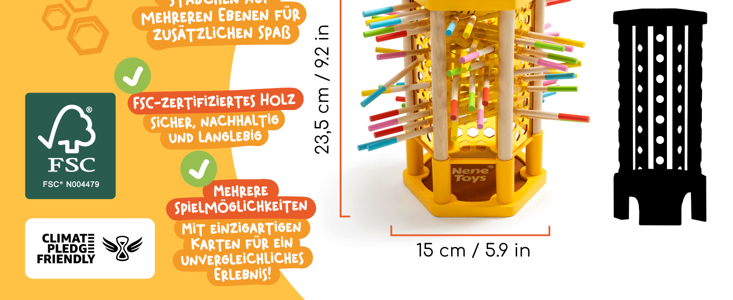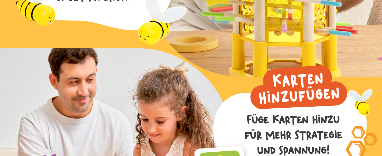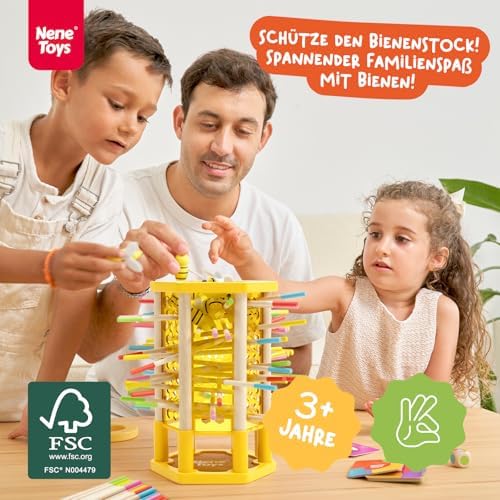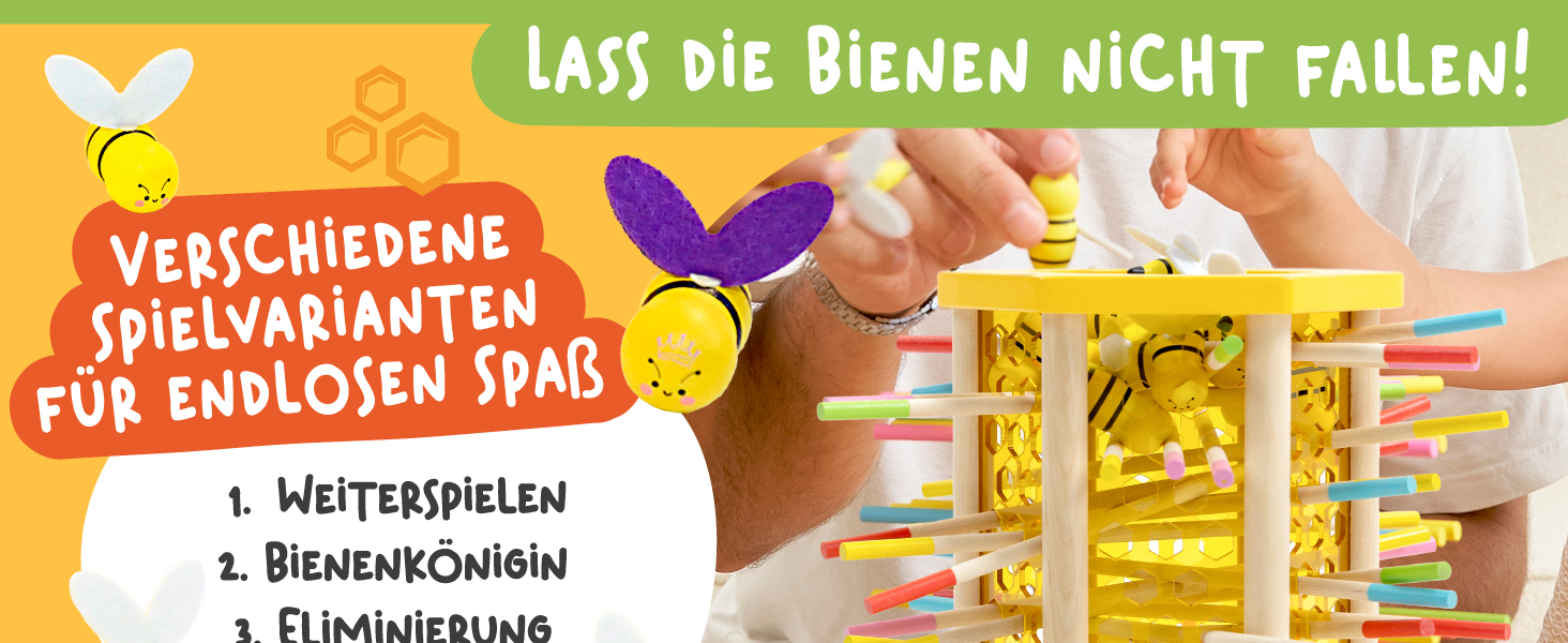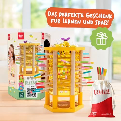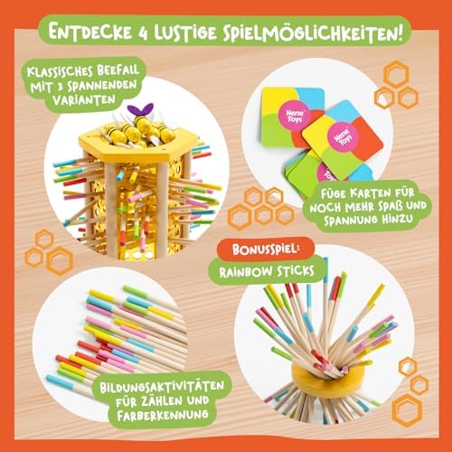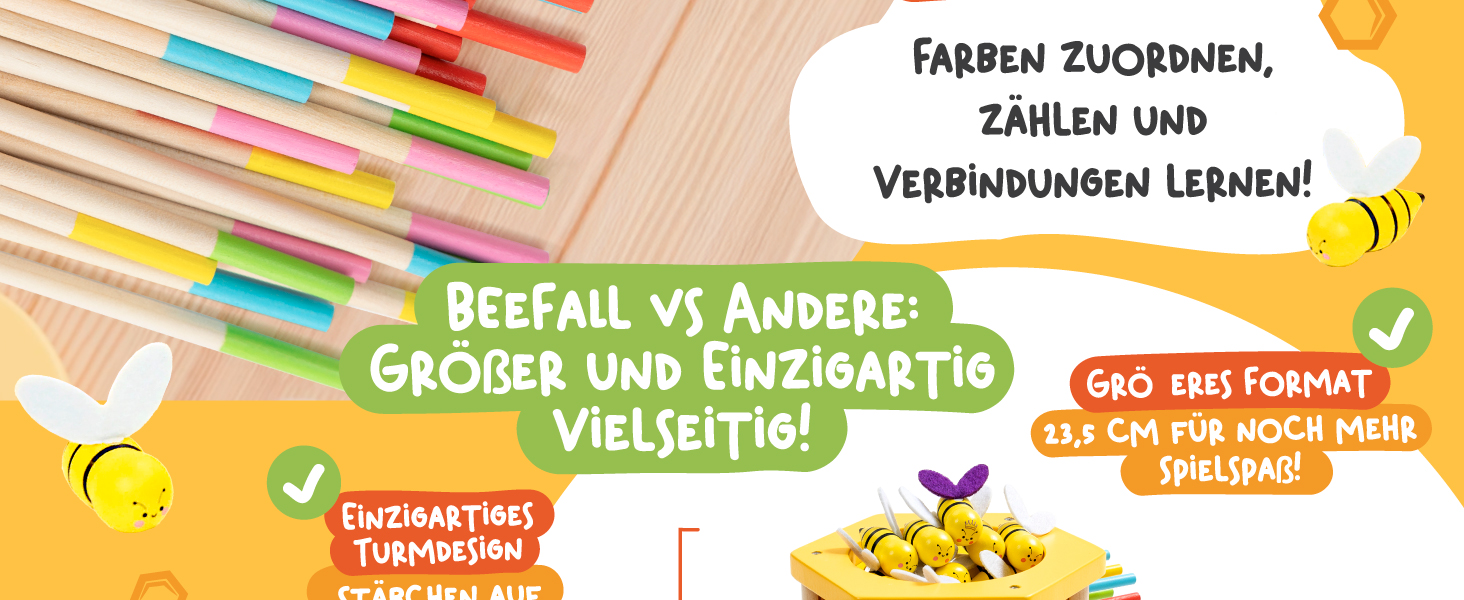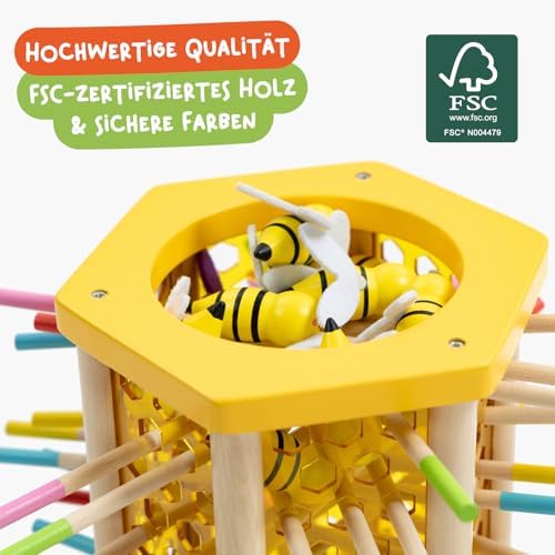 BeeFall besteht aus hochwertigem, ungiftigem Holz und ist für langlebigen und sicheren Spielspaß konzipiert. Die robusten Komponenten wie der Holz-Bienenstock, die bunten Stöcke und die süßen Bienen sind perfekt für aktives Spielvergnügen geeignet.