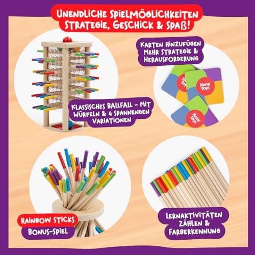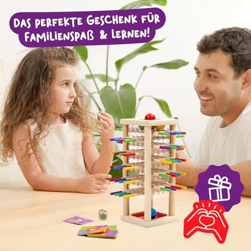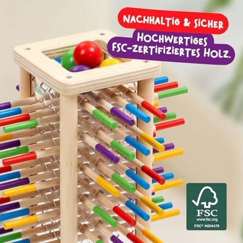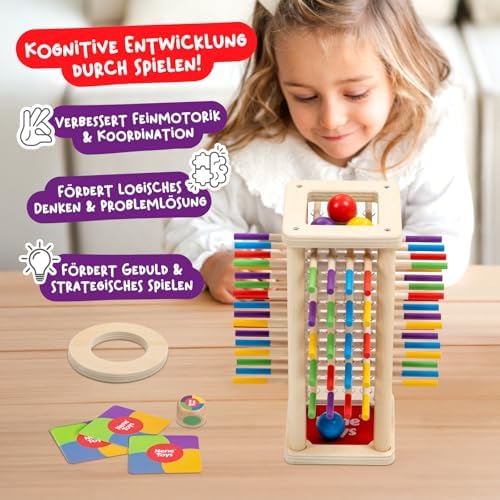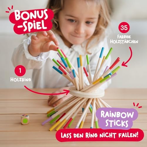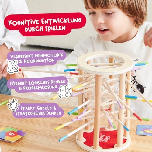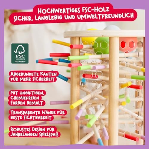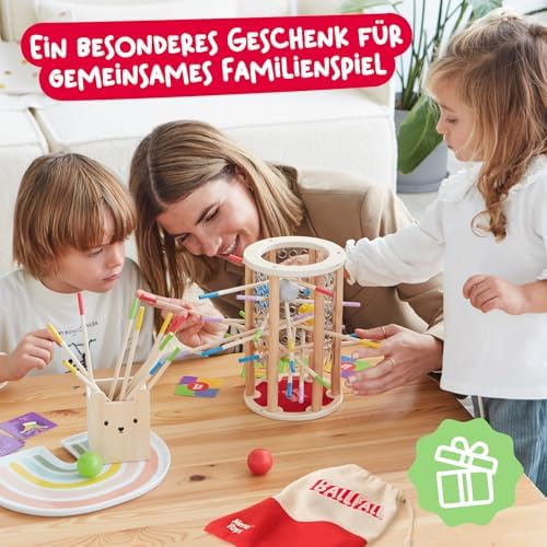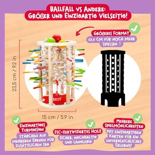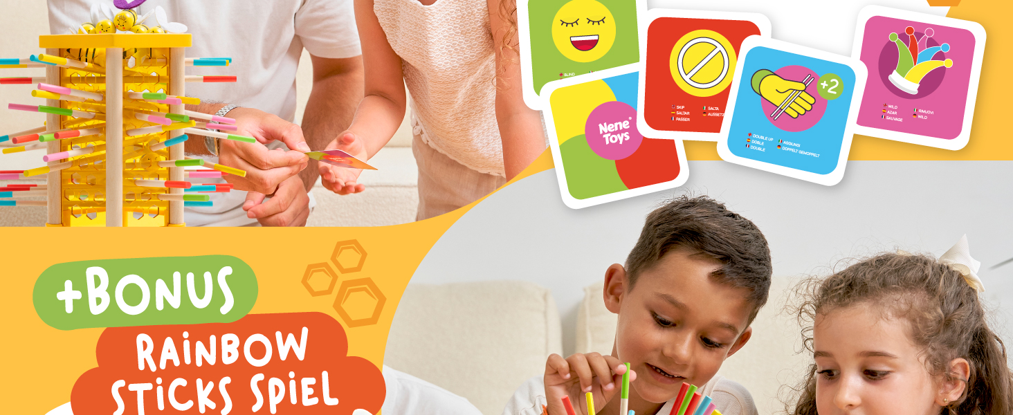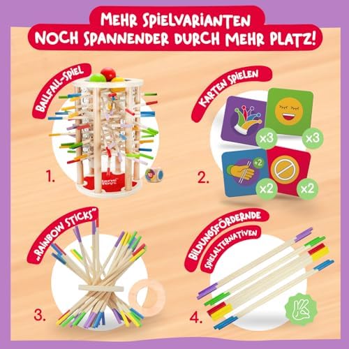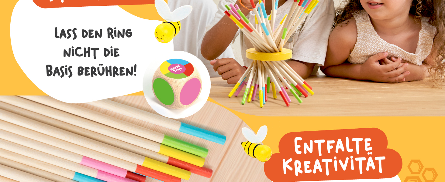 BeeFall besteht aus hochwertigem, ungiftigem Holz und ist für langlebigen und sicheren Spielspaß konzipiert. Die robusten Komponenten wie der Holz-Bienenstock, die bunten Stöcke und die süßen Bienen sind perfekt für aktives Spielvergnügen geeignet.
